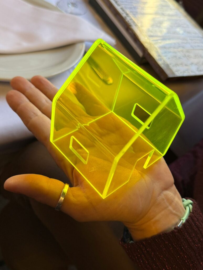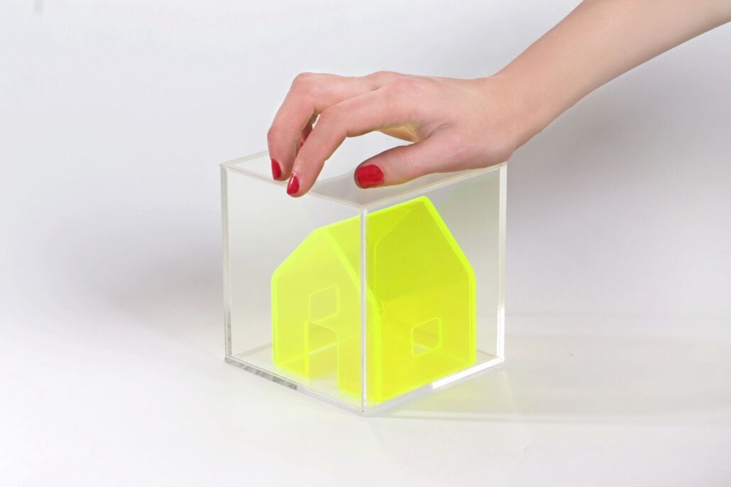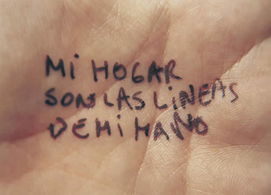 Interacción con objeto escultórico/simbólico de la casita con el público. La artista posa la casita en la palma de la mano del público. Una pieza que explora el concepto de hogar y la construcción de identidad : “Mi hogar son las líneas de mi mano¨. Sugiere que el hogar no es necesariamente un lugar físico, sino más bien un concepto o una sensación interior, una red de conexiones y experiencias que define a la persona. Y las líneas de la mano, representan esos lazos, esas huellas que definen quiénes somos y dónde pertenecemos.