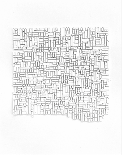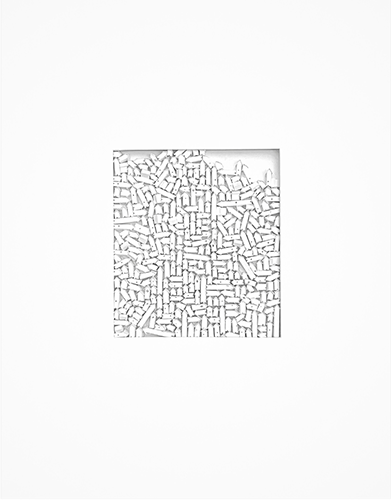 ANDREA FERNANDEZ Trabajando el papel encuentro historias, ideas, caminos y recuerdos. En el hacer aparece la manualidad y el cuidado, la dedicación y la técnica para construir lugares que quiero habitar. La tarea se va transformando en una meditación consciente donde el tiempo se diluye y el universo paralelo cobra sentido. La acción repetitiva, casi performática, la escala mínima y el papel como soporte me permiten narrar historias chiquitas e inmensas. Historias que también hablan de mí porque es allí, en el hacer, donde encuentro mi huella. Cartografiar milímetro a milímetro un espacio imaginario, superponer las paredes y perder de vista los contornos me permiten jugar con el vacío.