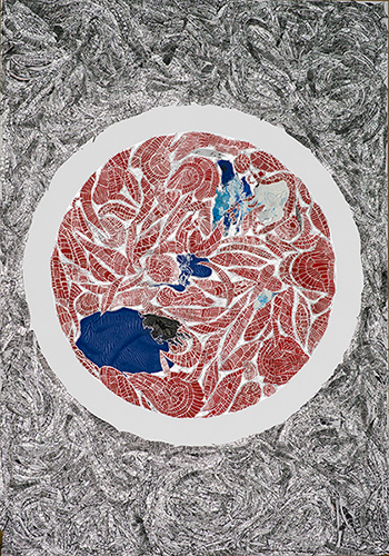 En cada trabajo integra figuras orgánicas, geométricas y manchas de diferentes texturas y materiales, dispuestas en capas superpuestas pero visibles, que dialogan entre sí y construyen espacios, realidades, mundos y universos.