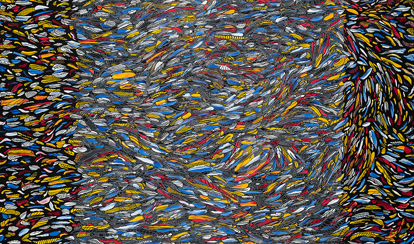 Representa una realidad que, a simple vista, aparece como diversa, dinámica y caótica en formas y colores; como si estuviera contenida, condicionada, organizada y estructurada por una matriz, un código del que nada escapa.