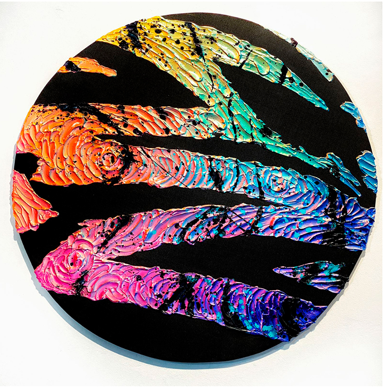 Me moviliza la conexión con lo interior, intento con mis obras materializar emisiones y usarlas como llave para despertar otras de igual intencionadamente en las personas que conectan con ellas. Durante el proceso de creación, generó texturas y hago fluir la pintura entre ellas buscando que la abstracción de las formas sucedan orgánicamente, como una especio de resiliencia del color ante los obstáculos.