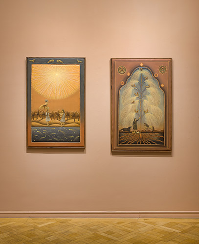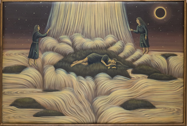 Encontré en la pintura el medio donde pude fusionar la adoración por las imágenes con el relato simbólico, lo oculto y lo secreto. Una práctica ritualista donde las imágenes se van develando en un proceso lento que no puede apurarse, no solo por la materialidad del óleo sino porque dependen de otro tiempo, de un tiempo que no nos pertenece. Veladura tras veladura las imágenes van abriéndose paso a la superficie, una pintura trae a la siguiente, como si no pudiese existir la una sin la otra. Las concibo como fotogramas de una película sin principio ni fin y puedo entender la vida y la existencia a través de ellas, en ese universo se produce un desdoblamiento y soy al mismo tiempo observadora y protagonista. Algunas pinturas toman la forma de talismanes, otras de ofrendas, de deseos y otras de protectores, pero sin duda contienen toda mi fe en la vida y sus ciclos.